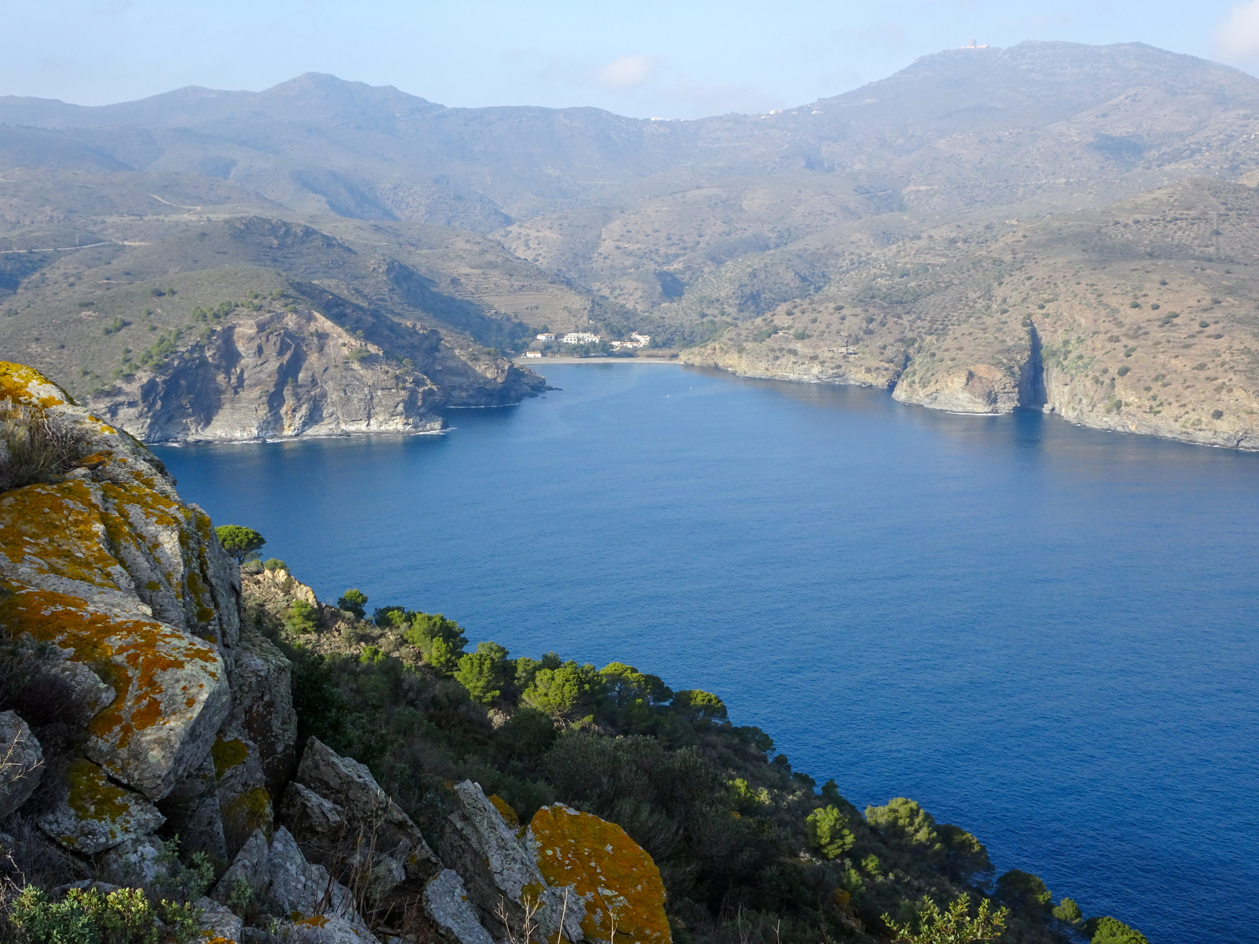 Nach einer gemütlichen Morgenrunde begeben wir uns mit dem Fahrzeug in die Richtung vom Nationalpark Cap Creus. Die Strasse windet sich zuerst der Küste entlang durch die Aussenquartiere von Rosas mit deren Ferienhäuser und Villen, bevor es Offroad der Küste entlang an vielen kleinen Buchten geht. Wir fahren an der malerischen Bucht von Montjoie mit dem ehemaligen Sternerestaurant ElBulli von Ferran Adrià vorbei bis zum Parkplatz als Ausgangspunkt zum Cap Norfeu. Hier starten wir einen ausgedehnten Spaziergang bis zu den Höhlen der Einsiedler, bevor wir den Anstieg zur Landzunge des Cap Norfeu in Angriff nehmen. Eine gigantische Rundsicht begleitet uns auf der Anhöhe und wir können auf der einen Seite die Küste in Richtung Süden bis zu den Madras Inseln sichten und auf der anderen Seiten die Bucht der Cala Joncols und im Landesinneren die Sternwarte auf dem Puig del Pení. Die Farben Grün, Blau und Grau kontrastieren stark und die Wege sind durch wilden Rosmarin, Pfeffer, Föhren und Feigenkakteen gesäumt. Eine tolle Rundwanderung, welche auf dem Torre del Norfeu endet, bevor wir den Abstieg auf den Parkplatz in Angriff nehmen. „Dorli“ die Hündin von Siegarts hat grosse Freude und macht vermutlich die Summe aller unserer Distanzen während dem Nachmittagsauslauf.