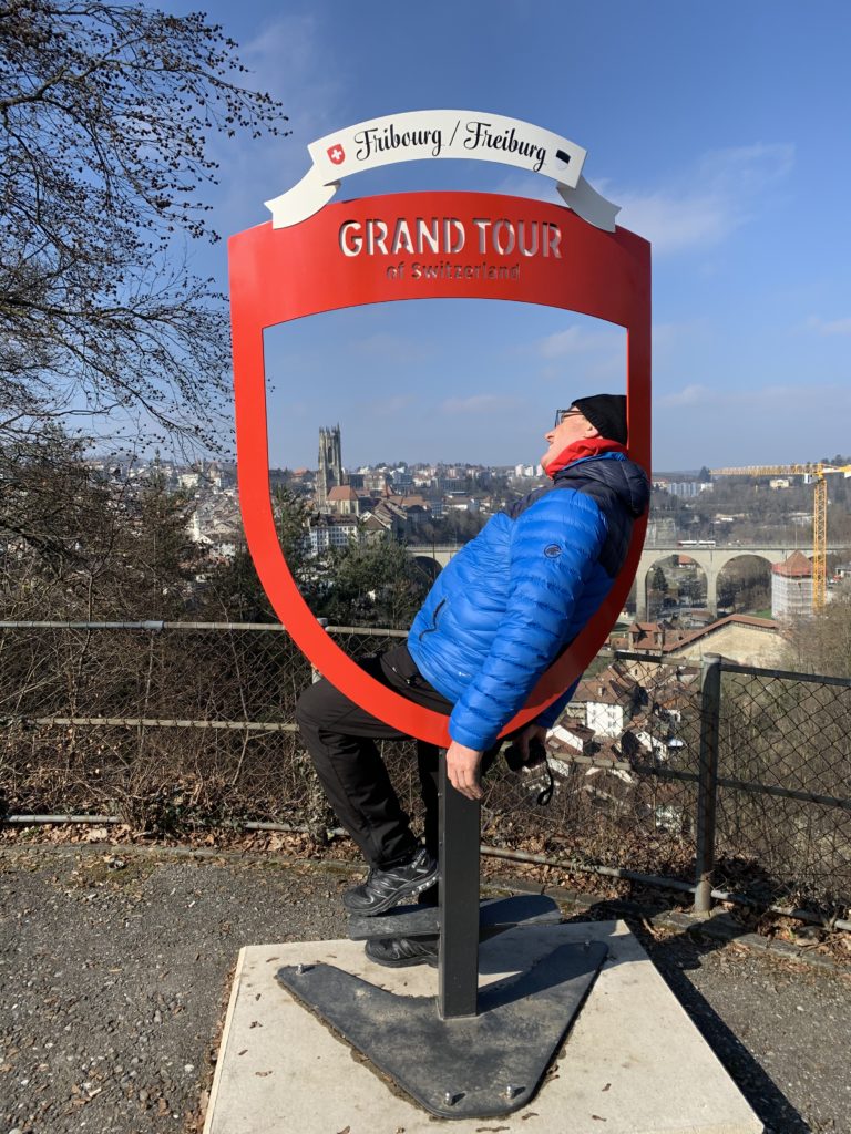 Wir verbinden unseren Freiburger Stopp mit einem Spaziergang vom Murtentor runter zur Saint-Nicolas Kathedrale über die Zähringerbrücke auf die Seite des Schönberg Quartiers. Wir laufen weiter zur Gotteron-Brücke und überqueren diese. Was suchen wir da? Natürlich den Foto Point der Grand Tour mit Blick auf die Altstadt von Fribourg. Der Aussenminister ist leider bereits müde vom vielen Laufen 🙂