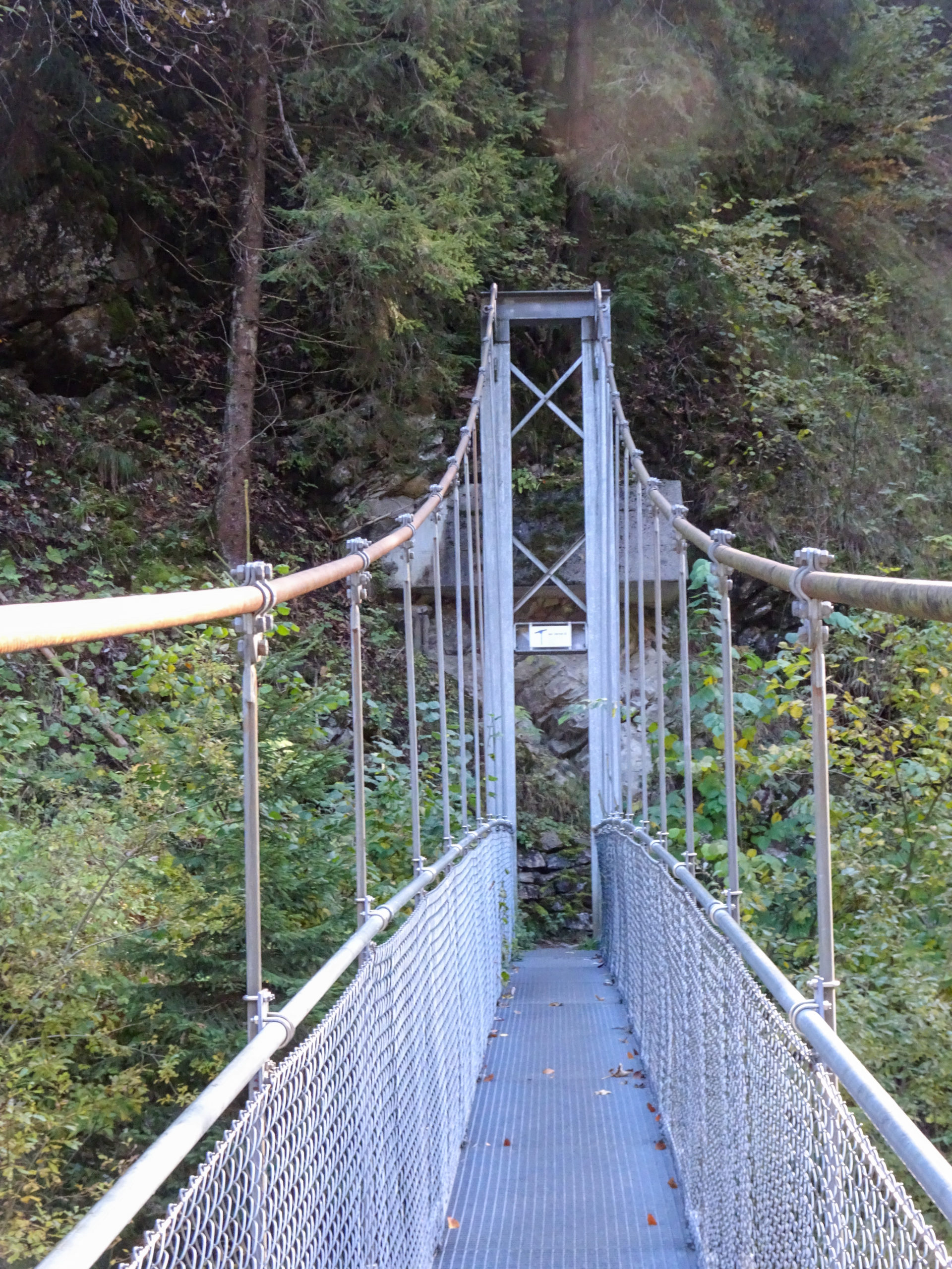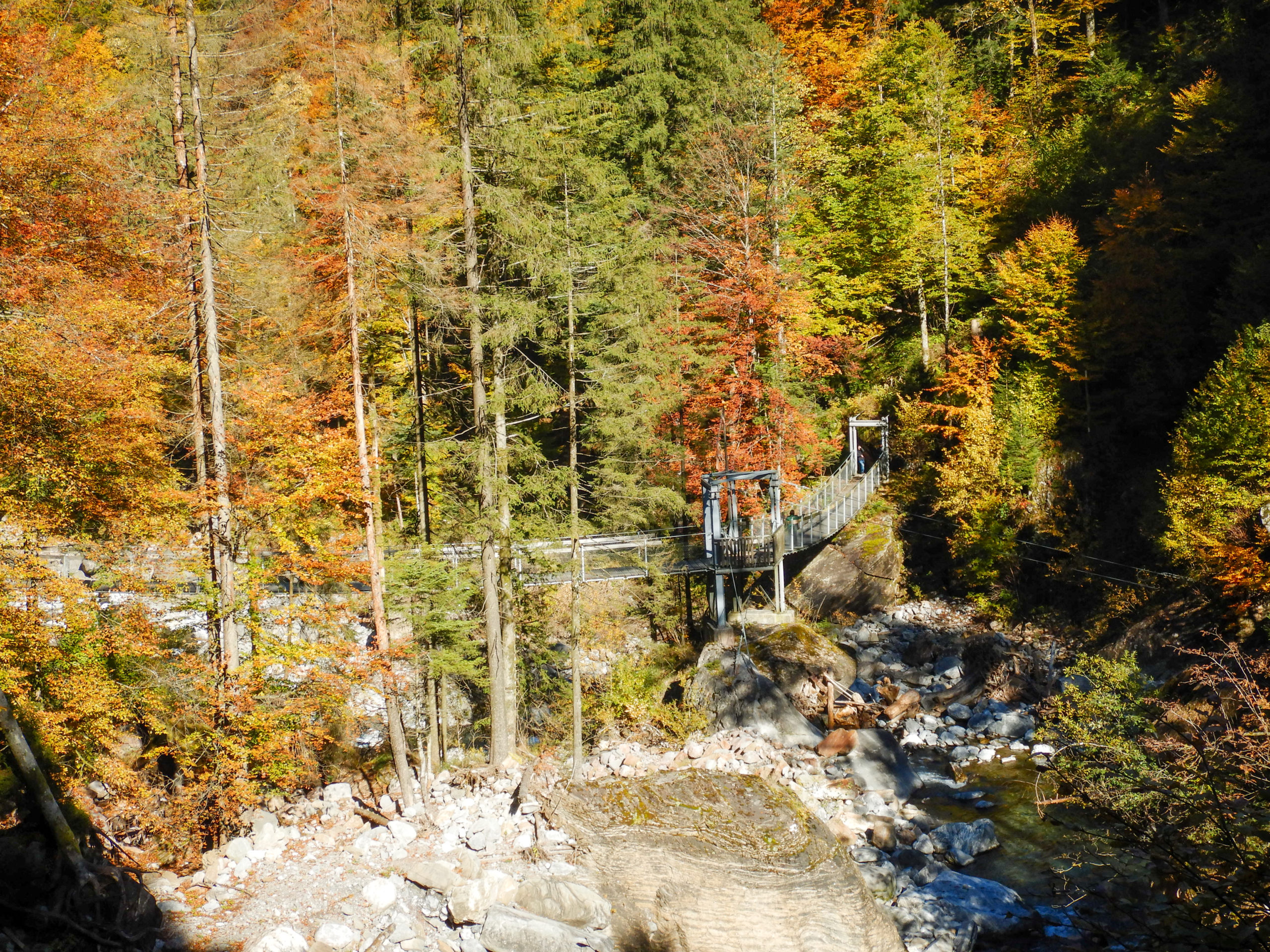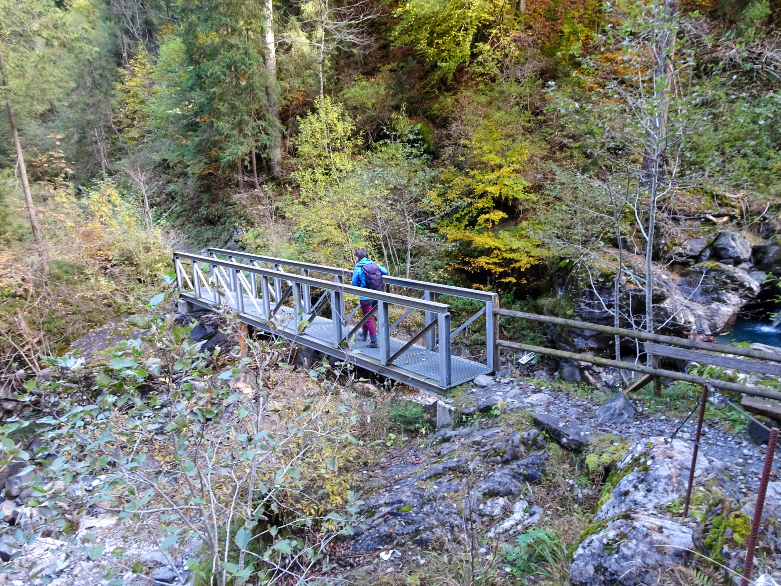 Am Samstag frühstücken wir ausgiebig und gegen 10:30 Uhr kommt auch endlich im Eienwäldli die Sonne über die Berge. Was für tolle Farben in den Herbstwäldern. Schnell sind wir bereit und ziehen los. Erstes Ziel ist an der Engelberger Aa entlang ins Dorf und am Dorfausgang zum Eugenisee. Dort wollen wir den Wanderweg der Engelberger Aaschlucht nach Grafenort bewandern. Selbstverständlich hat der Weg auch drei Hängebrücken zu bieten, was es für uns so spannend macht. Der Einstieg ist bereits eine erste Überraschung. Die ersten rund 100m wurden weggespült und kurzerhand wird eine provisorischer Weg unter der Strassengalerie mit einer einfachen Holzbrücke errichtet. Wirklich toll gemacht und wir sehen, welche Kraft das Wasser hier im Tal jeweils bei Unwettern hat.