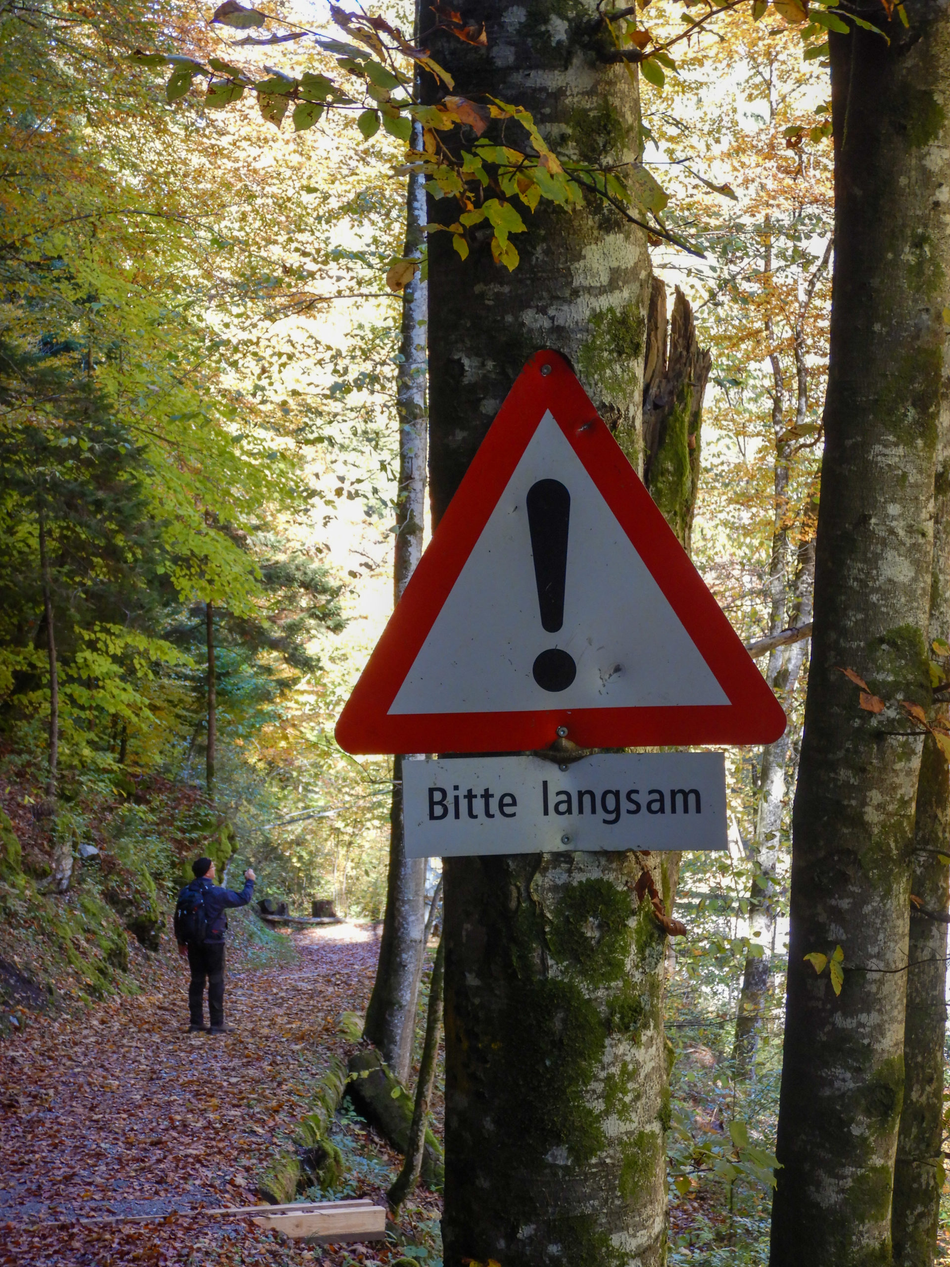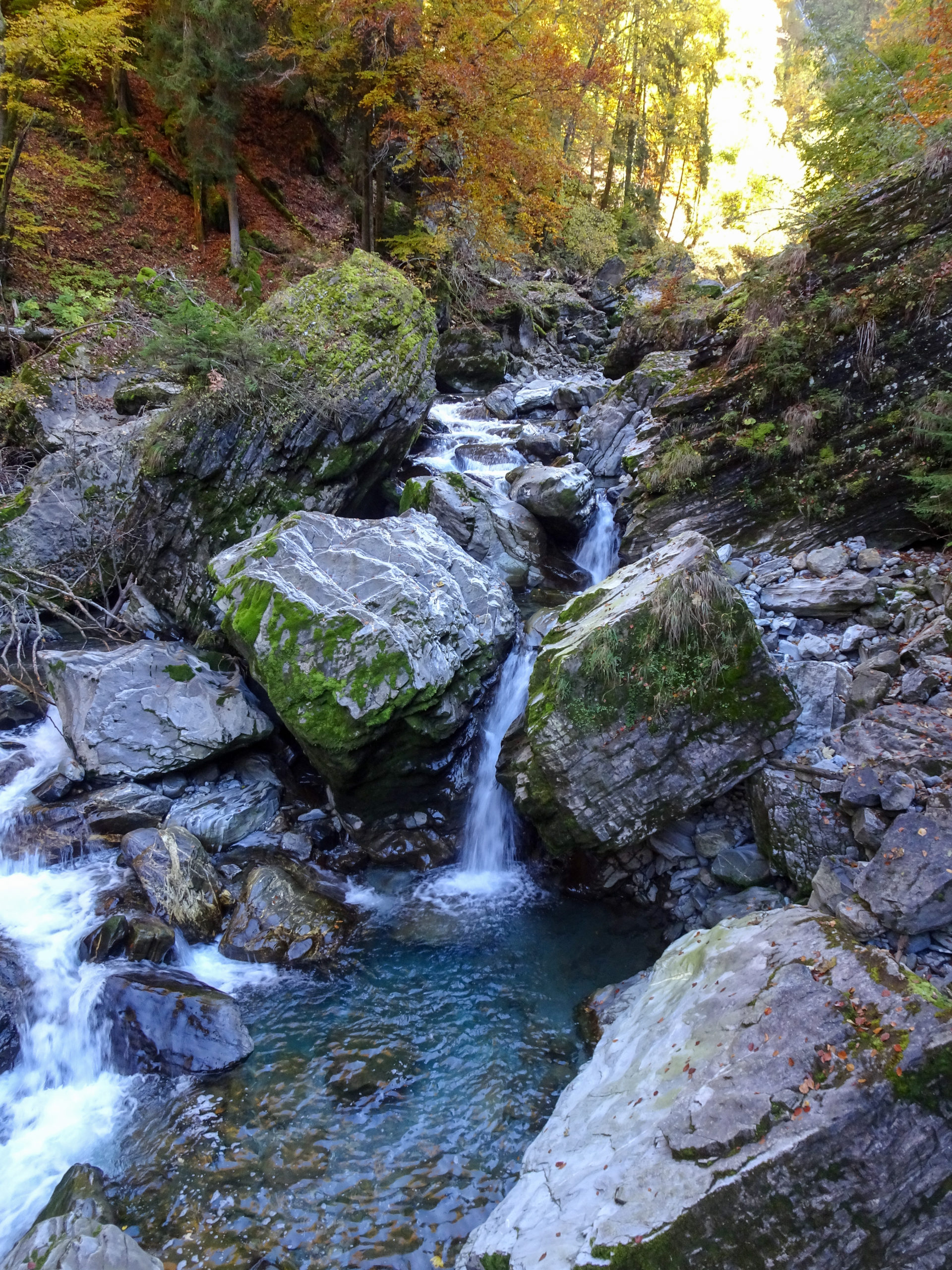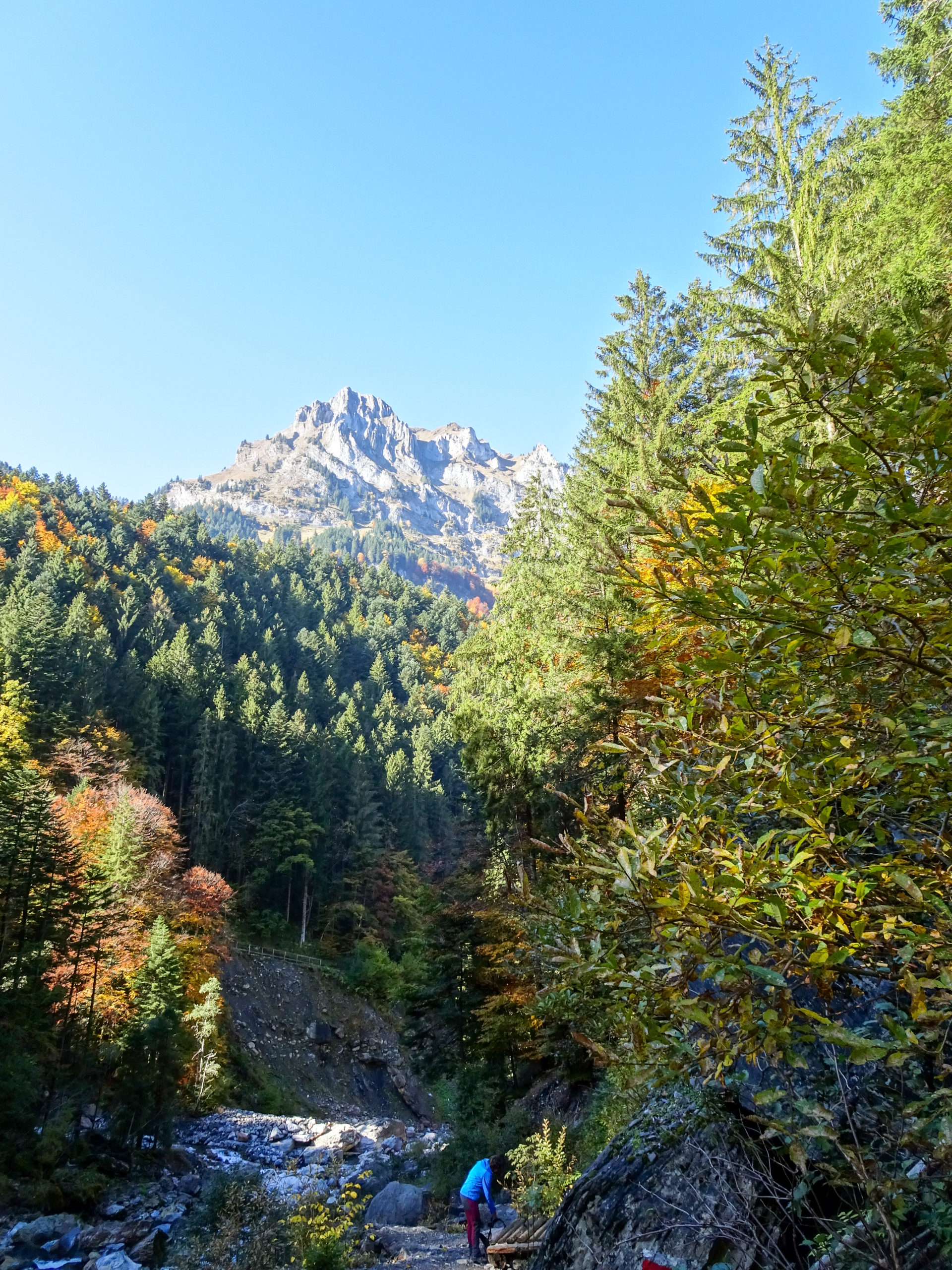 Am Samstag frühstücken wir ausgiebig und gegen 10:30 Uhr kommt auch endlich im Eienwäldli die Sonne über die Berge. Was für tolle Farben in den Herbstwäldern. Schnell sind wir bereit und ziehen los. Erstes Ziel ist an der Engelberger Aa entlang ins Dorf und am Dorfausgang zum Eugenisee. Dort wollen wir den Wanderweg der Engelberger Aaschlucht nach Grafenort bewandern. Selbstverständlich hat der Weg auch drei Hängebrücken zu bieten, was es für uns so spannend macht. Der Einstieg ist bereits eine erste Überraschung. Die ersten rund 100m wurden weggespült und kurzerhand wird eine provisorischer Weg unter der Strassengalerie mit einer einfachen Holzbrücke errichtet. Wirklich toll gemacht und wir sehen, welche Kraft das Wasser hier im Tal jeweils bei Unwettern hat.