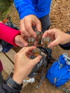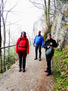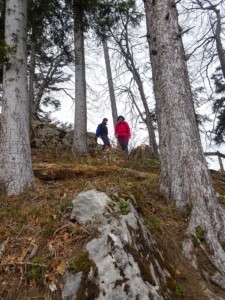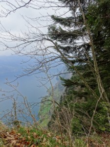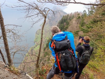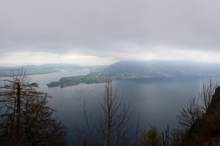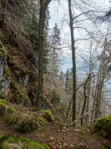 Die beiden Aussichtsplattformen sind nochmals absolut eindrücklich und offenbaren noch einen freieren Blick in Richtung Gotthard und Urnerland. Wir können es uns nur ausmalen, wie es wäre bei sonnigem Wetter. Nach all dem Prunk und Monney, beginnt nun unsere eigentliche Wanderung in Richtung Ennetbürgen. Da der Felsweg in Richtung Endziel am Hammetschwandlift infolge Steinschlag noch geschlossen ist, laufen wir nun auf der Ennetbürgerseite des Vierwaldstättersees in Richtung der Kappelle St. Joost. Der Weg ist grösstenteils im Wald entlang der Kantonsgrenze zwischen Luzern und Nidwalden. Der Blick und die Abhänge in Richtung Norden sind partiell richtig atemraubend, bevor es einen massiven Abstieg zur Riedmattweid gibt. Zwischenzeitlich stärken wir uns um auch die zweite Streckenhälfte noch ohne Hungerast in Angriff nehmen zu können.