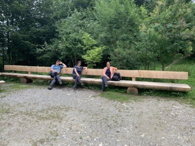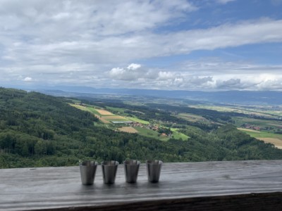 Wir geniessen die Aussicht, trotz bewölktem Wetter. Diese ist einfach grandios und super dokumentiert, was zu diversen Aha Effekten führt. Lehrreich die Geografie einmal so zu erleben. Nach einem kleinen Schluck Höhentrunk, nehmen wir den Abstieg in Angriff. Kurzfristig ändern wir die Route und laufen anstelle nach Schüpfen über den Höhenkamm des Frienisberg auf den Schüpberg. Eine wunderschöne Route auf dem Bergkamm, welche durch die Wälder und Bauerndörfer führt, runden diesen Nachmittag ab. Nach 10 Kilometern erreichen wir das Schüpbärg Beizli und genehmigen uns eine kleine Erfrischung, bevor uns der Taxidienst wieder einsammelt. Danke Andrea und Steffi für diesen tollen Tag!