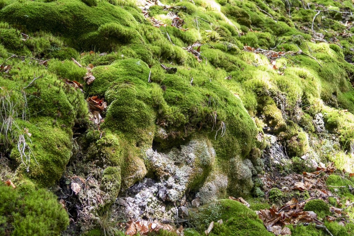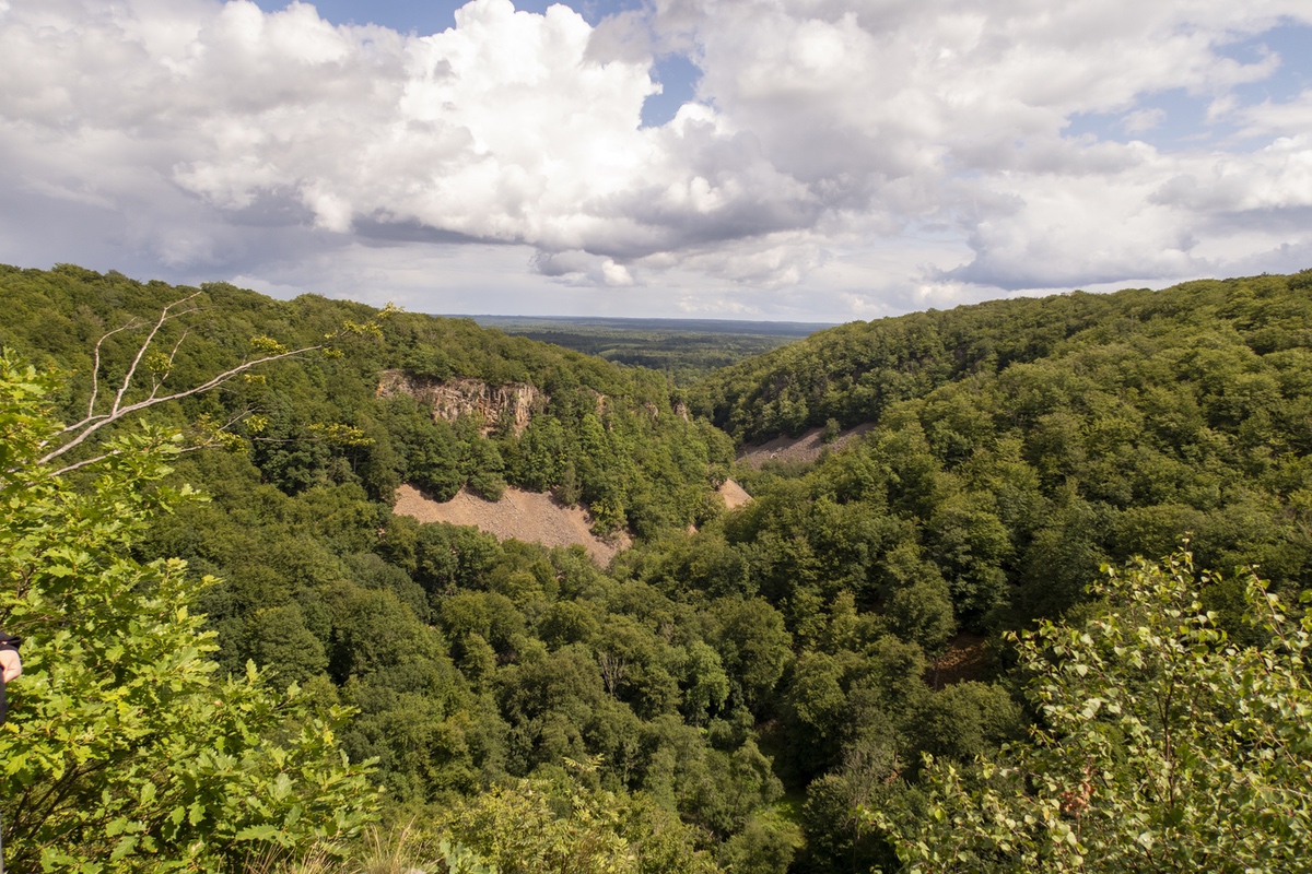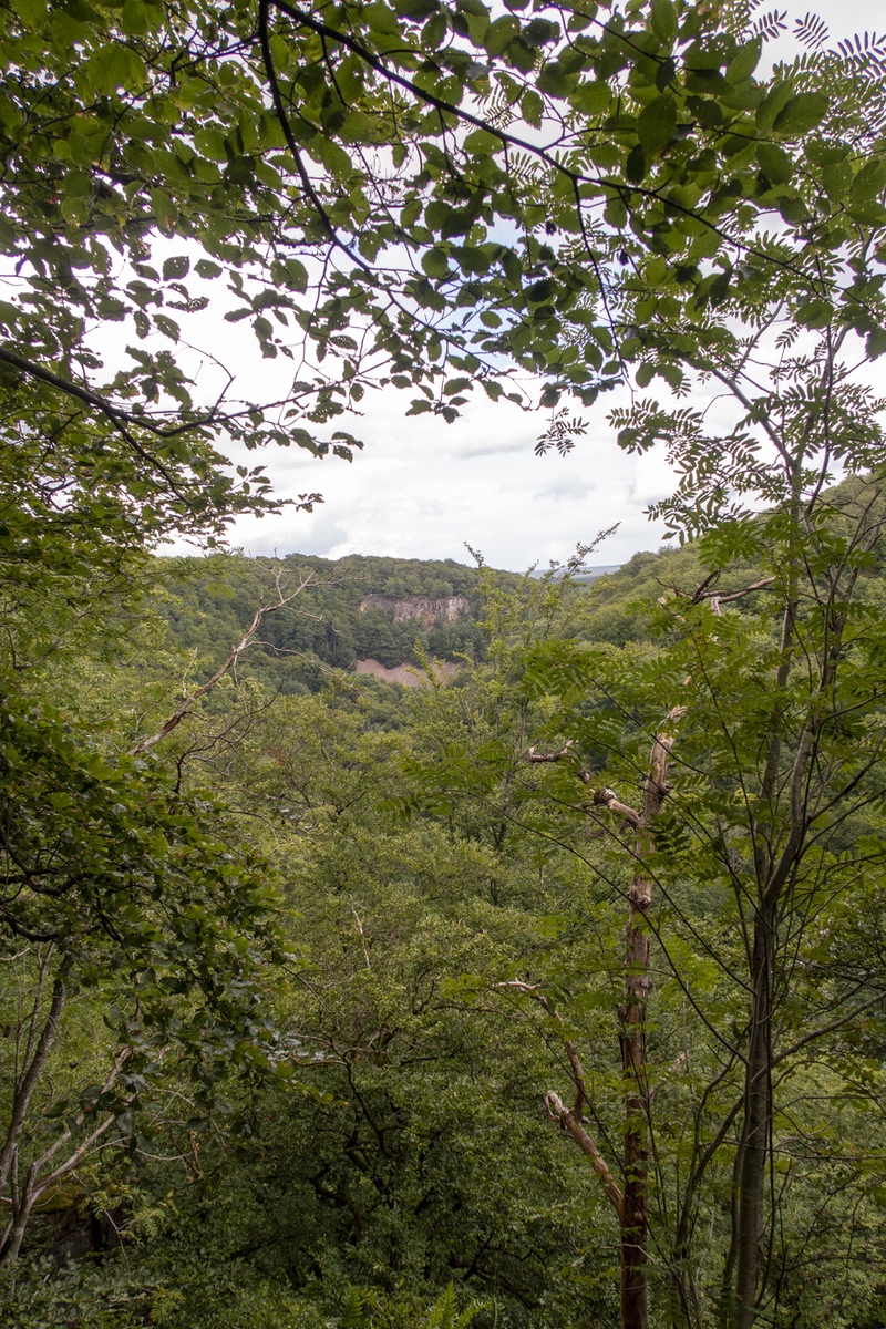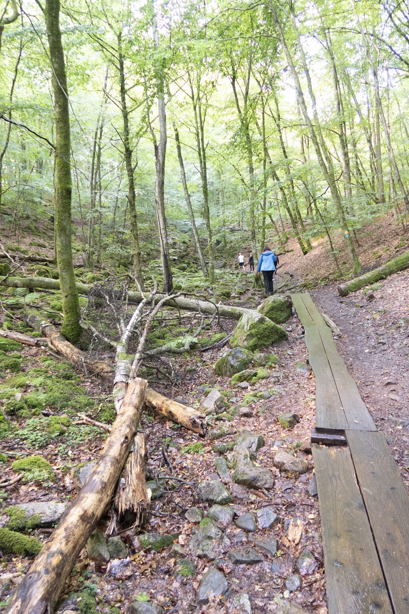 Wir wählen eine kurze Route, wo wir zuerst in den Talkessel hineinlaufen. Am Ende des kleinen Sees geht die Talsohle in einen plätschernden Bach über, welcher von hohen Klippen und mächtigem Geröll aus Felsblöcken und Steinen gesäumt ist. In den freiliegenden Geröllfelder, welche den Hang bilden, sind die Reste von versteinertem Basalt des 110 Mio. Jahre alten Vulkanausbruchs zu sehen. Darüber und überall, wo kein Geröllfelder sind, gedeiht ein toller Buchenwald. Das Gebiet ist eines der grössten zusammenhängenden Edellaubwälder von Nordeuropa.