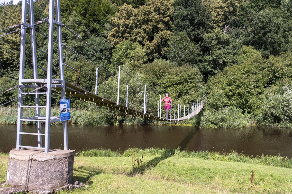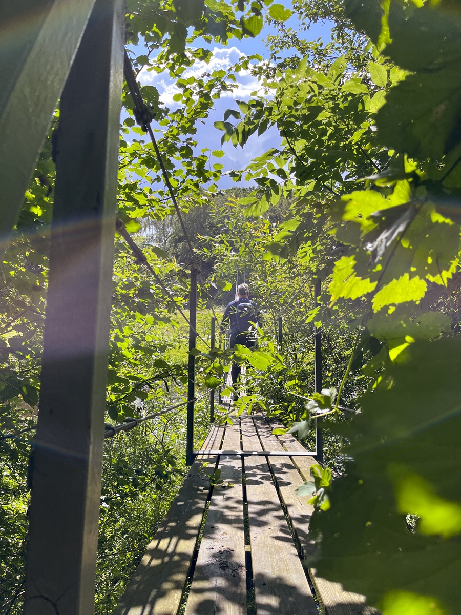 Es geht zuerst der Strasse entlang zu einem Pferdezüchter und von da einem Feldweg den Weiden entlang. Irgendwann wissen wir, müssen wir den Weg über Weide und Wald selber suchen… Kann also spannend werden. Mutig wagen wir uns durch eine Viehweide in einen Wald und von da einen schmierigen Pfad hinunter an die Rönne å, ein kleiner lokaler Fluss. Plötzlich stehen wir an der Rückseite eines Schiesstandes, eine Hängebrücke können wir aber noch immer nicht sehen. Also weiter vor durch den dichten Wald und hinter dem Magazin des Schiesstandes sehen wir im mitten vom dichten Waldrand eine Hängebrücke…